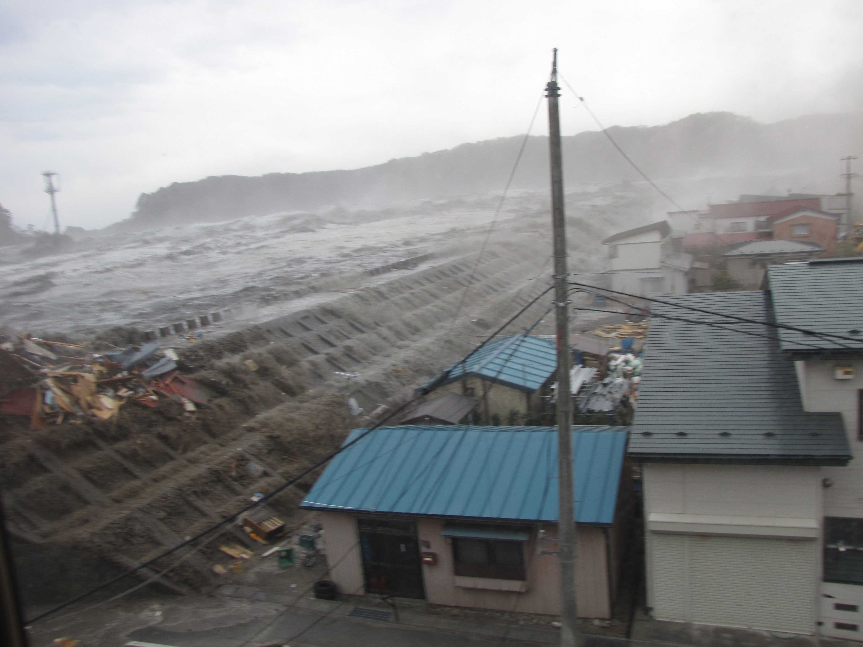 | 解説 | 大津波が宮古市を襲い、閉伊川河川堤防を越波した瞬間。 |