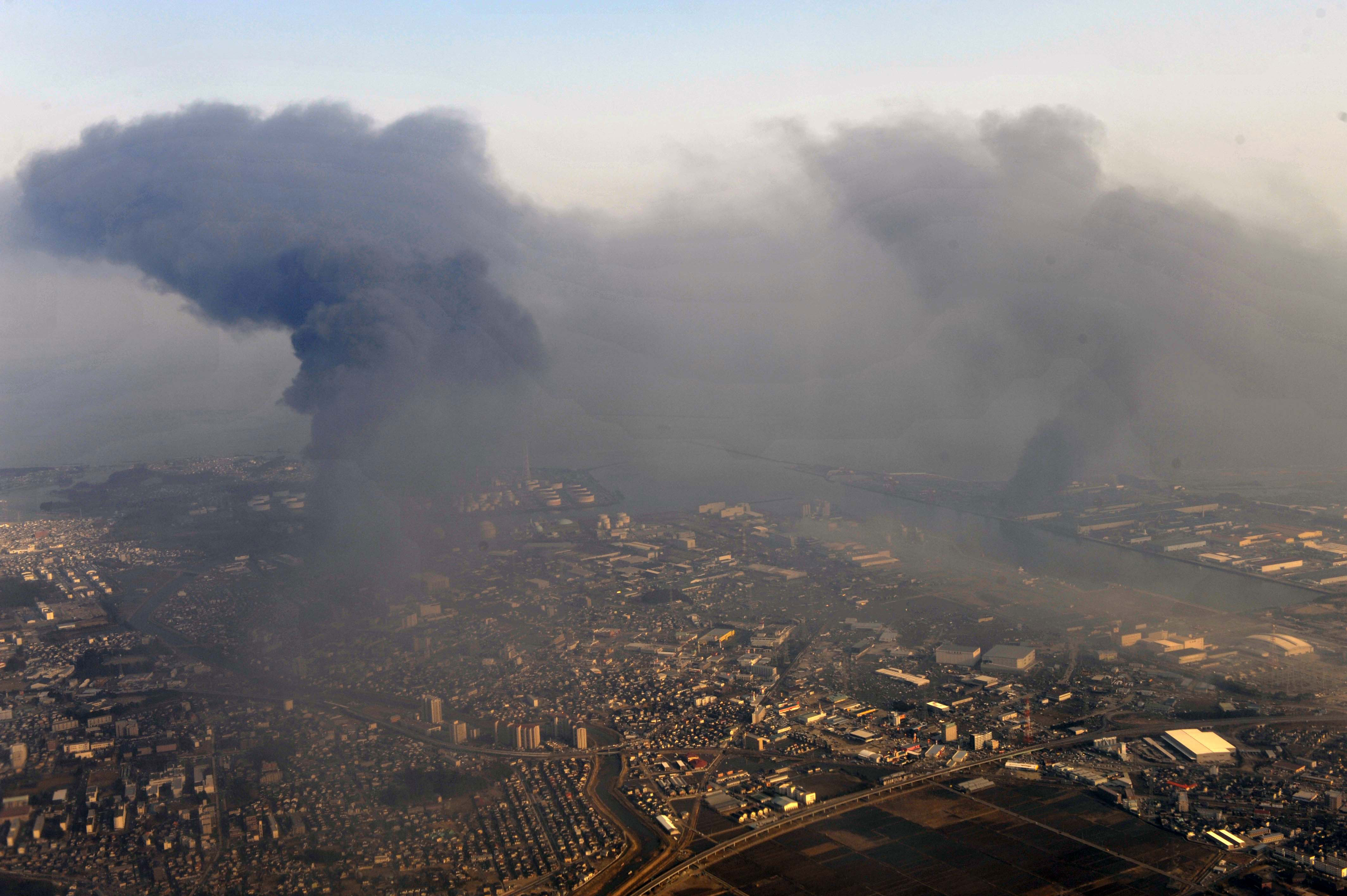 | 解説 | 発災2日後の多賀城市内。仙台港のコンビナート火災が鎮火に向かう。 |