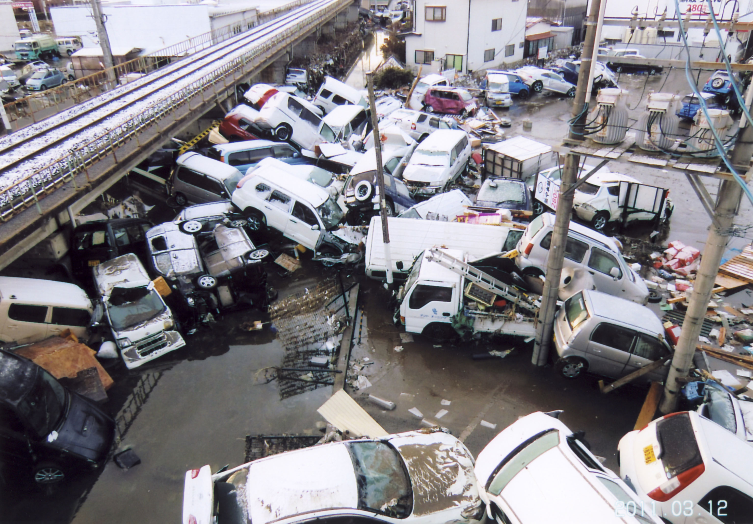 | 解説 | 多賀城市内JR仙石線高架橋まで津波に押し流された自動車。市街地では車両等の流出が多かった。 |