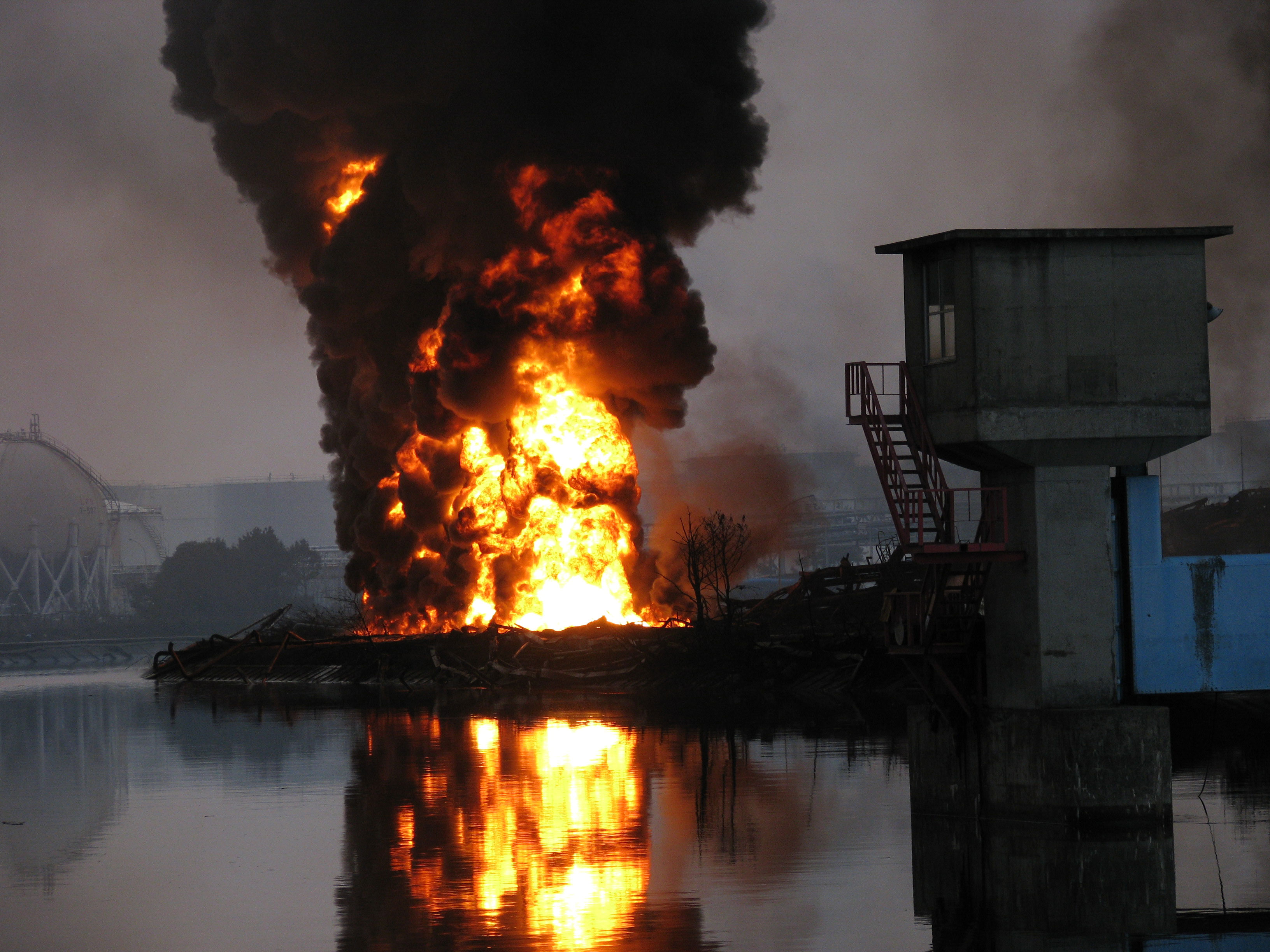 | 解説 | 仙台港のコンビナート群で火災が発生し、黒煙が上がっている様子。 |