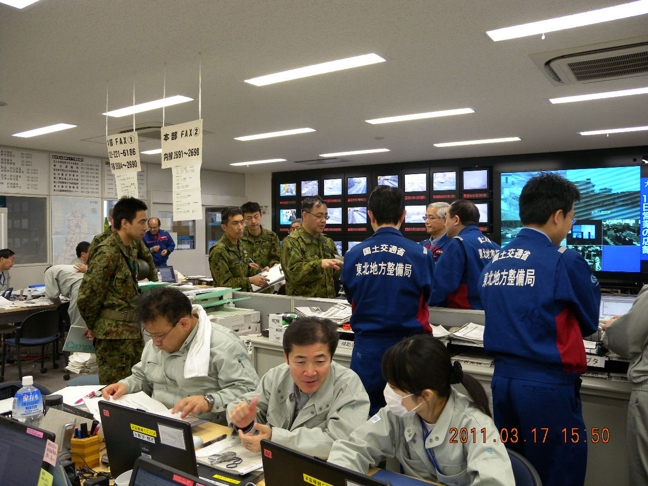 | 解説 | 3月17日東北地方整備局災害対策室。自衛隊と連携し緊急対応へ。 |