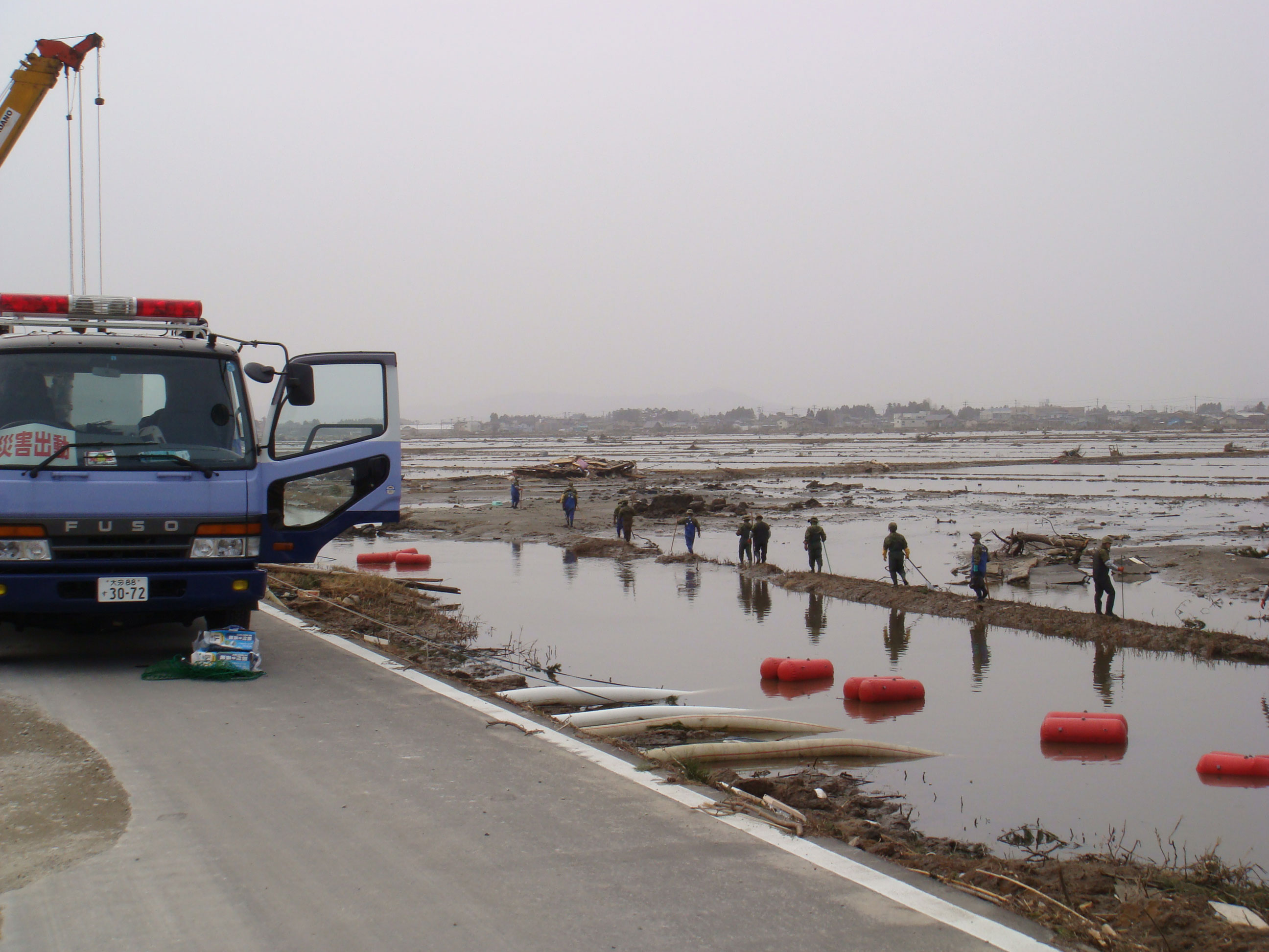 | 解説 | 岩沼市藤曽根における排水ポンプ車の作業状況。 水位低下により自衛隊による行方不明者の捜索が行われた。 |