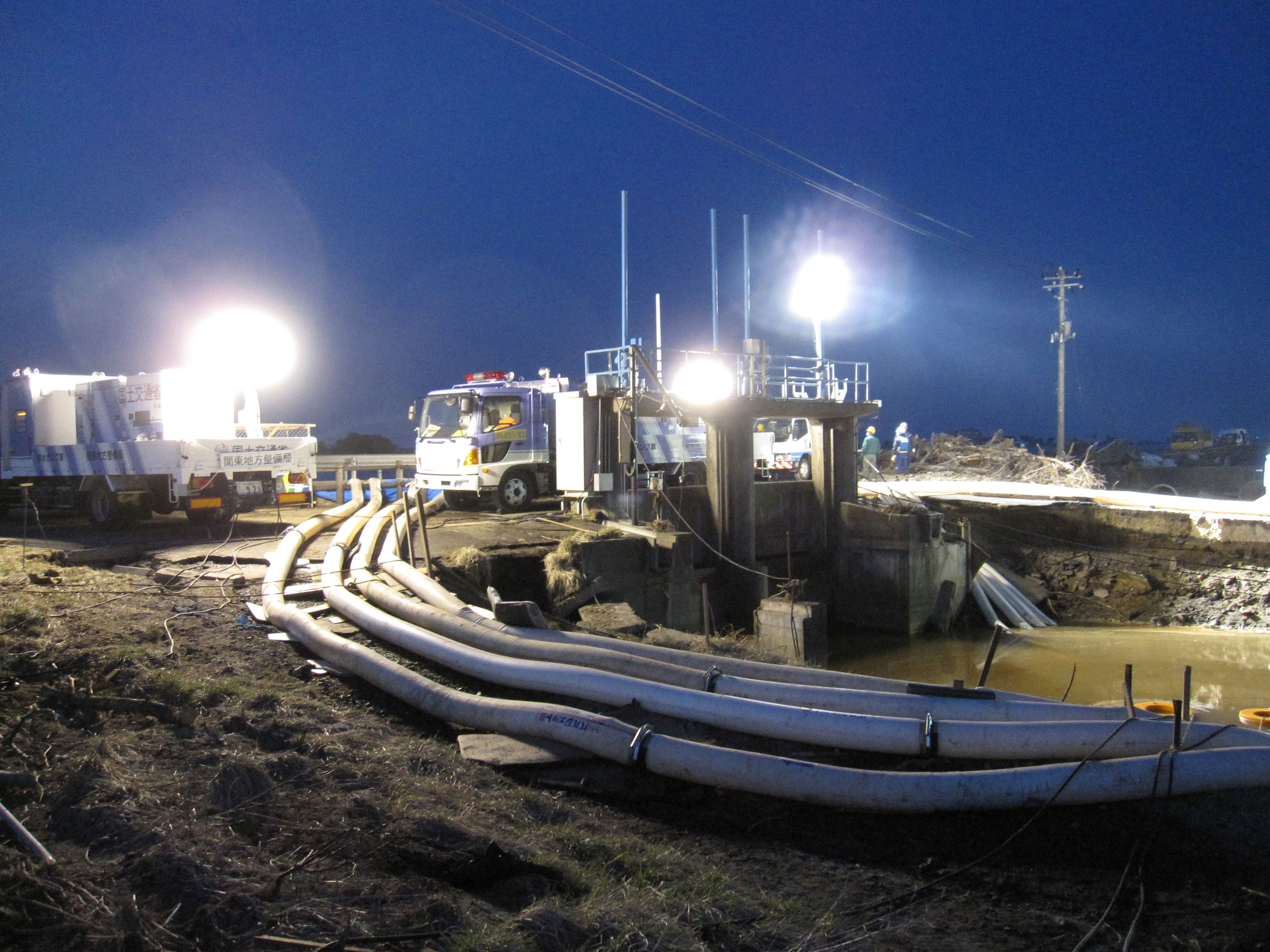 | 解説 | 亘理町大畑浜排水機場付近における関東地方整備局の排水ポンプ車による作業状況。照明車も投入し24時間態勢で排水作業を行った。 |