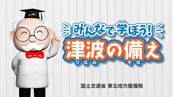 津波博士が登場し、クイズ形式で津波から身を守る方法を教えてくれる動画です。 子供にも親しみやすいようにアニメーションにし、海外の方もわかるように英語版も制作しました。 津波から身を守る方法を学ぶときにご利用ください。 みんなで学ぼう!津波の備え 6’00 Let's Learn about Tsunami ! 5’34