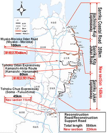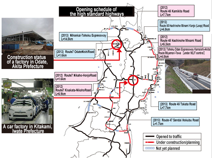 In November 2011, an entire expressway connecting cites along the Sanriku Coast was designated as a “Reconstruction Road”, a leading project of the region’s reconstruction plan led by the Government of Japan.