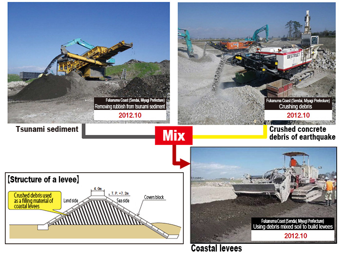 The earthquake debris has been used as a construction material of coastal levees.