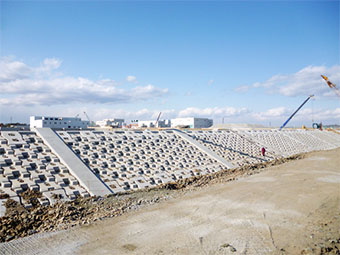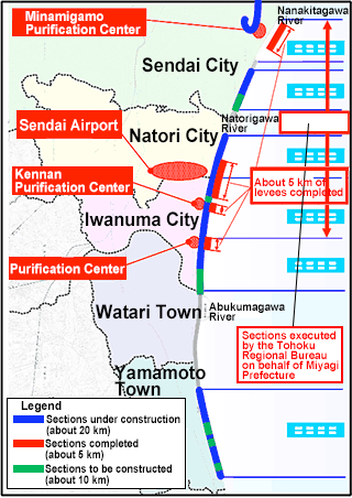 The coastal levees adjacent to important facilities, such as Sendai Airport, the Sewage Treatment Center, etc., are scheduled to be completed by March 2013.