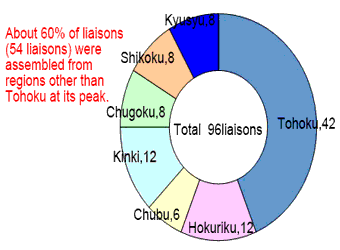 They were called liaisons (on-site information coordinator for disaster response). Liaisons coordinated with various support organizations, according to the needs of the municipalities they understood. Liaisons are good at coordination between the prefectural and state organizations, and familiar with the relevant laws. They sometimes worked as local staffs on behalf of the municipal staffs who were completely occupied with disaster responses, and at other times as important and trusted partners of the municipal leaders. The liaisons were sent to 31 municipalities in 4 prefectures. The number of liaisons sent was 96 on March 23 at its peak. Total number of liaisons reached 3,916 by June 30, counted after the occurrence of the disaster.