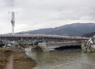 太平洋沿岸を走る国道45号は、巨大津波によって各所で寸断され、橋桁が流出するなど大きなダメージを受けた。道路啓開が完了した所から応急復旧を進め、橋梁流出箇所も迂回措置や仮橋による対応が展開された。仮橋の延長210.6mとなった気仙大橋(岩手県陸前高田市)も、河川の浚渫作業後に仮橋本体の工事にかかり、わずか61日で完成。7月10日に2車線での交通確保が可能となった。