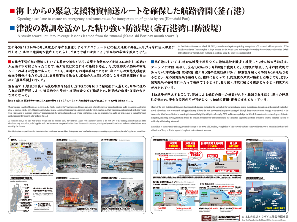 釜石港においては、大規模に被災した湾口防波堤であったが、津波高4割、流速5割、遡上高5割の低減効果があり、防潮堤を越える時間も6分遅延させるなど、一定の減災効果を発揮した。復旧にあたっては、同規模の津波が襲来した場合でも、防災・減災効果が長時間にわたって発揮できるように、粘り強く津波に耐える構造となるよう創意工夫が施されている。