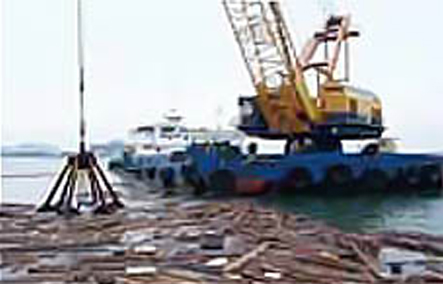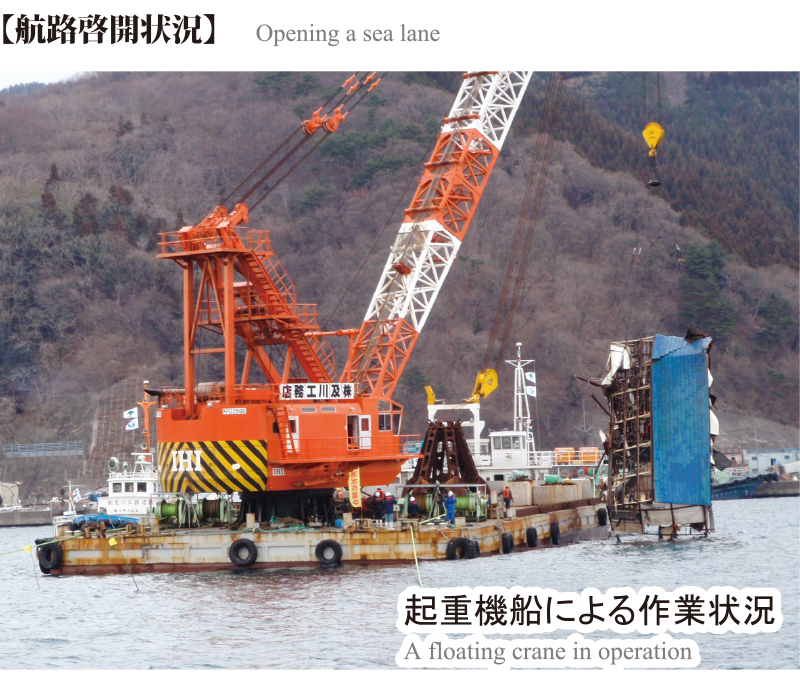 支援物資や燃料の輸送ルートを早急に確保するべく、海洋土木業界の協力で全国から集結した起重機船により、海上・海底の障害物の除去を行う「航路啓開」を行い、船舶の入出港を早期に確保した。
