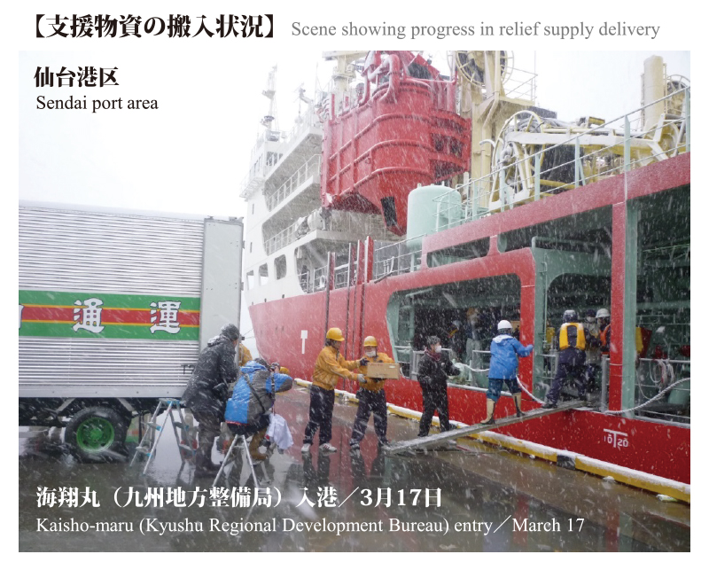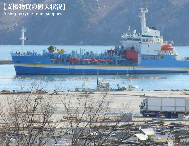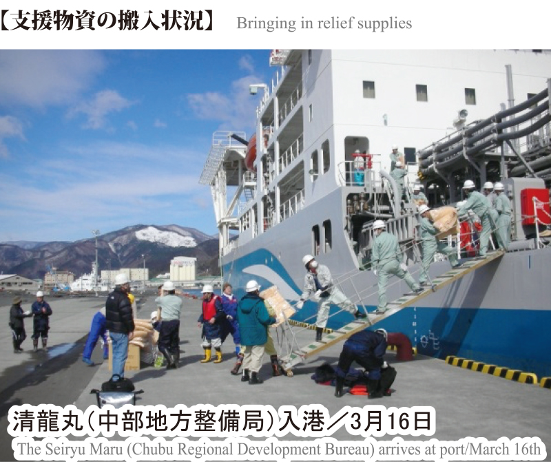 支援物資・燃料の輸送ルートを早急に確保するべく、震災直後より航路啓開を実施した。結果、発災から6日後の3月17日に第一船が入港し、被災地へ非常食や支援物資が届けられた。