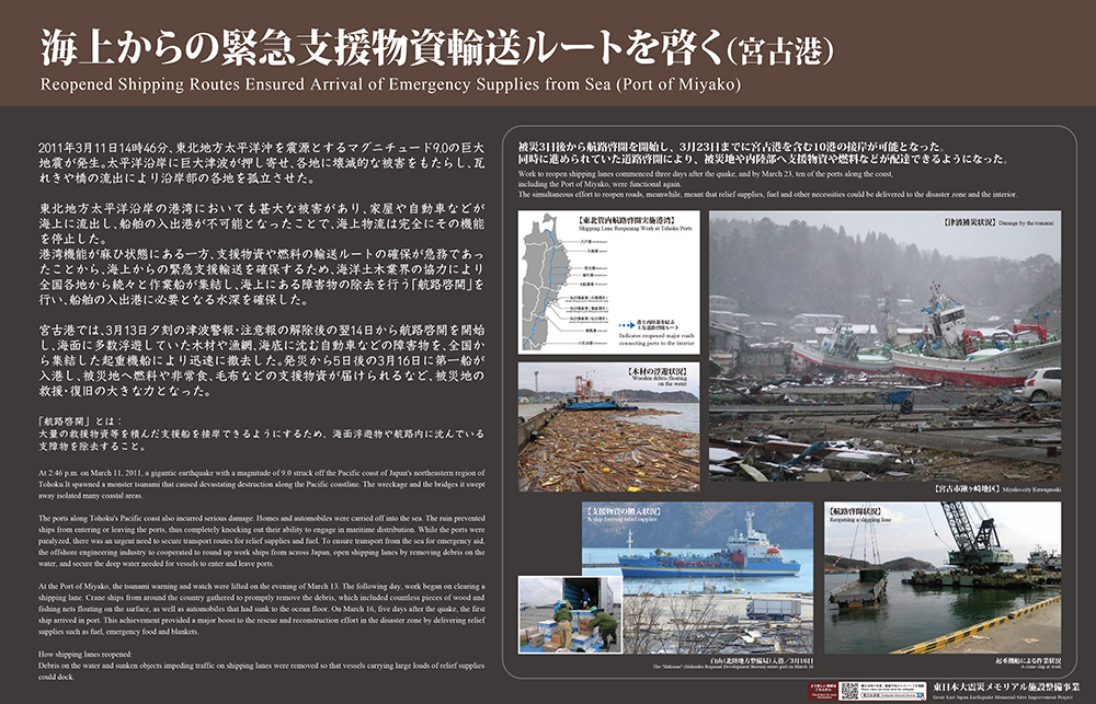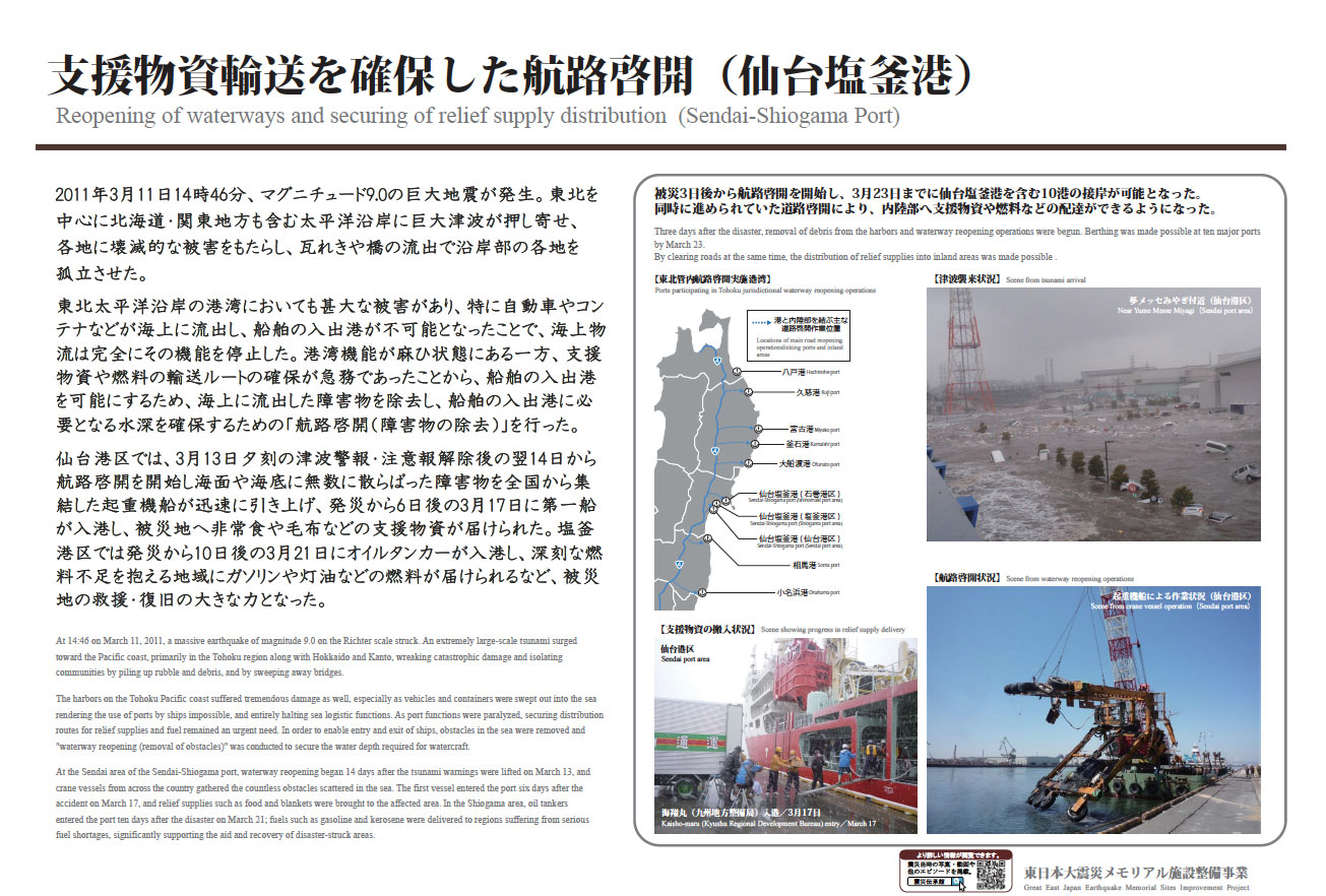 被災3日後から航路啓開を開始し、2日後の3月16日に輸送船が入港した。同時に進められた道路啓開により、被災地や内陸部へ支援物資などが輸送され、被災地の救援・復旧の大きな力となった。