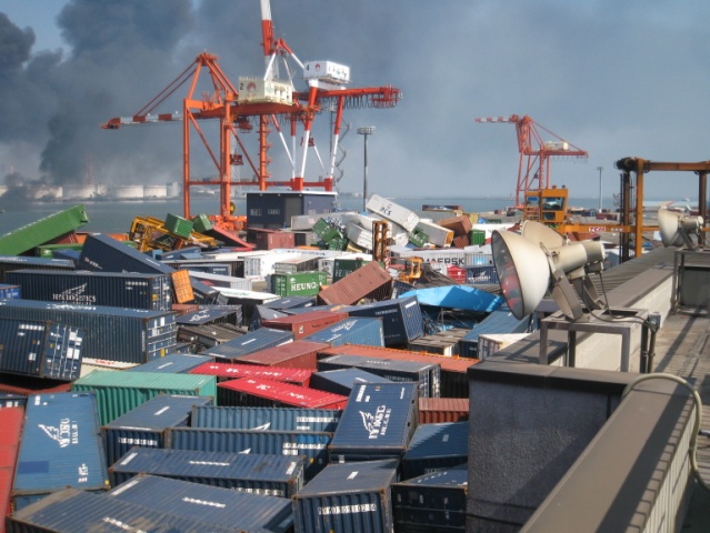太平洋沿岸に押し寄せた津波により、自動車やコンテナ等が港に流入し、船舶の入出港が不可能となった。
