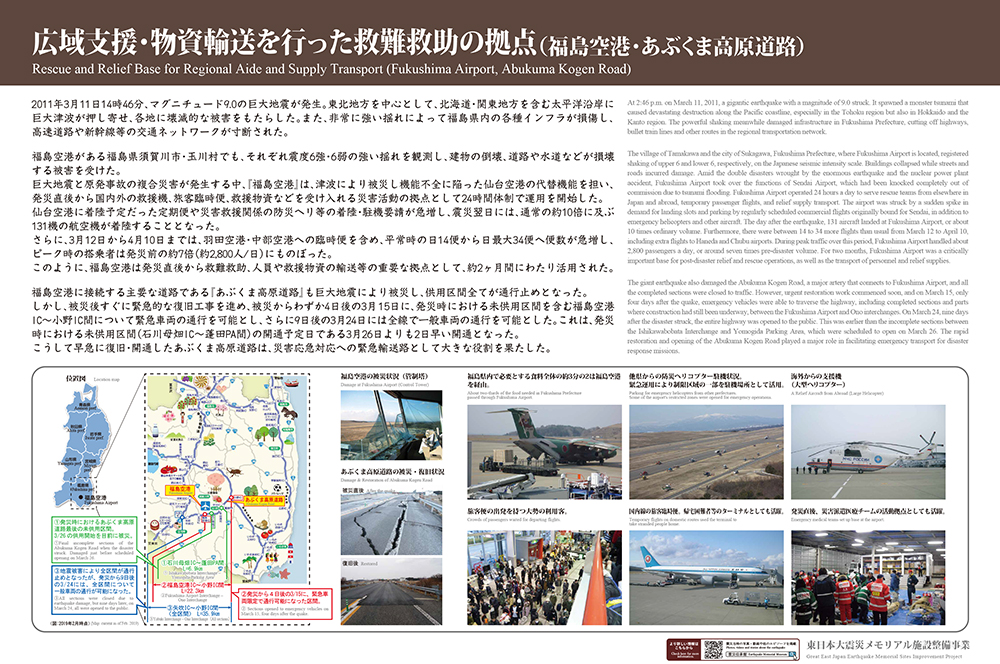 また、福島空港に接続する「あぶくま高原道路」も被災し、通行止めとなったが、被災直後に復旧工事を開始し、わずか4日後には福島空港IC~小野IC間について緊急車両の通行を可能とした。 さらに9日後には全線で一般車両の通行を可能とし、災害応急対応への緊急輸送路として大きな役割を果たした。