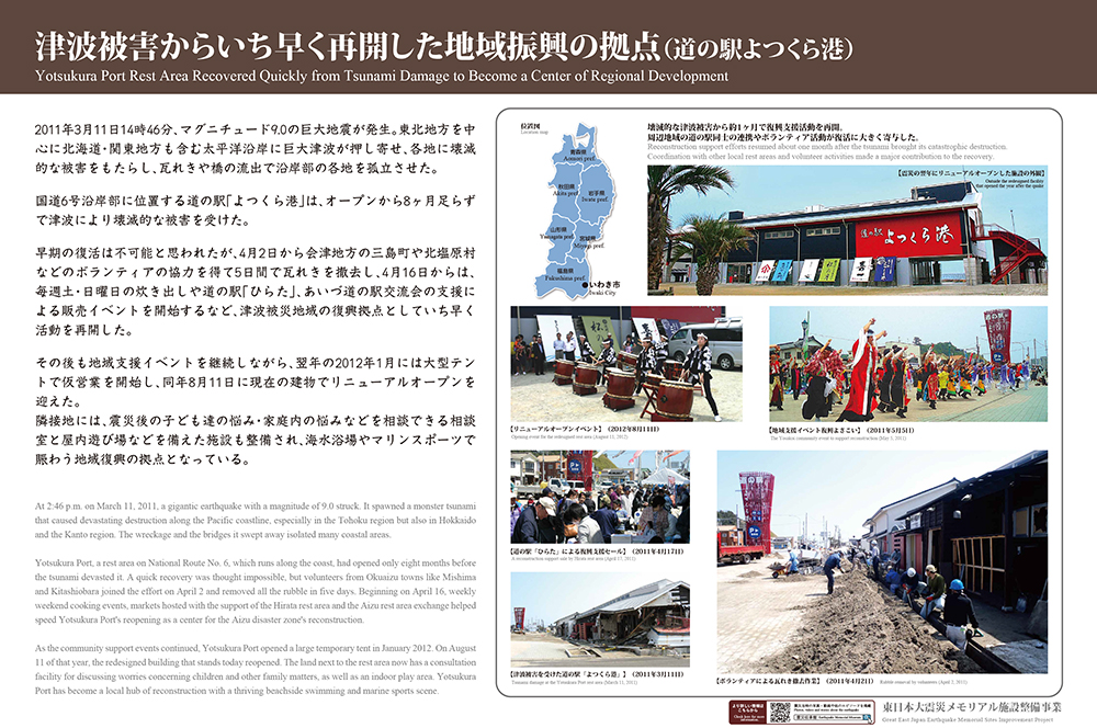 国道6号沿岸部に位置する道の駅「よつくら港」は、オープンから8ヶ月足らずで津波による壊滅的な被害を受けた。早期の復活は不可能と思われたが、会津地方の三島町や北塩原村などのボランティアの協力を得て5日間で瓦れきを撤去し、4月16日からは、毎週末の炊き出しや道の駅関係者の支援による販売イベントを開始するなど、津波被災地域の復興拠点としていち早く活動を再開した。